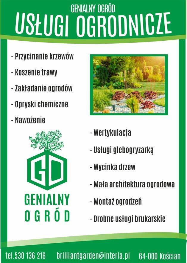 Misją zespołu Genialny Ogród jest: - zadowolenie i satysfakcja klienta, - kompleksowe zakładanie trawników, -fachowa pomoc i doradztwo z trawnikiem, -profesjonalna pielęgnacja trawników przez naszych ogrodników w Poznaniu, - kompleksowe usługi ogrodnicze w Poznaniu, -dokładna i profesjonalna pielęgnacja ogrodów i terenów zielonych przez naszych ogrodników w Poznaniu, - rzetelność usług ogrodniczych, - wszystko realizujemy z największą starannością i dokładnością aby klient mógł spędzać czas w ogrodzie niczym się nie martwiąc, - nasze zlecenia prowadzimy" od a do z " od wyboru najlepszych roślin aż po porady ogrodnicze na początku jak i na koniec realizacji aby Państwa ogród mógł zawsze wyglądać GENIALNIE! Pozdrawiamy Genialny OgródSprawdź zainteresowanie tym ogłoszeniem